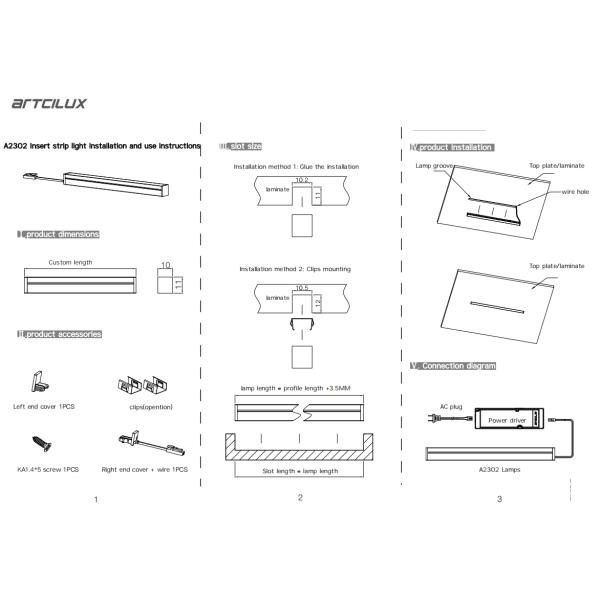 A2302 recessed strip light, Aluminum+PC, 300-3000(length)x10(width)x11mm(height), DC12V/DC24V, 7.5W/M, Ra>90, triple color temperature ( warm white, white, cold white), SMD2835 / 120PCS/M, 1500mm input line length